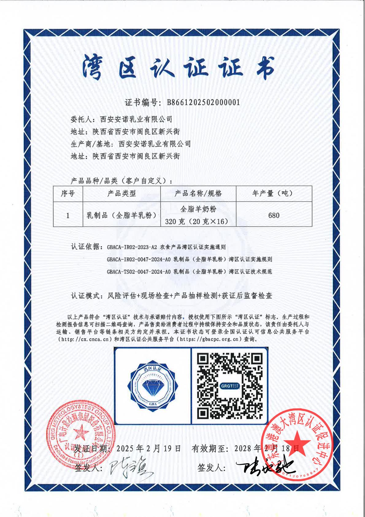 2025年2月19日,安諾乳業(yè)旗下全脂羊奶粉榮獲灣區(qū)認(rèn)證證書,成為粵港澳大灣區(qū)大健康食品領(lǐng)域首批獲得該認(rèn)證的羊乳制品企業(yè)。這不僅是安